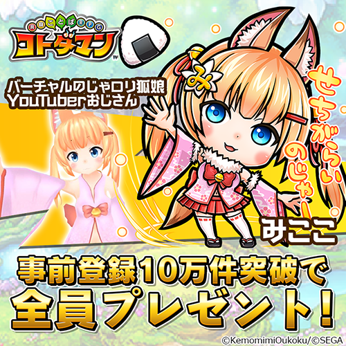 事前登録者数10万件突破で全ユーザーに、「バーチャルのじゃロリ狐娘YouTuberおじさん」として活躍する「ねこます」さんとのコラボキャラクター「みここ」がプレゼントされます。