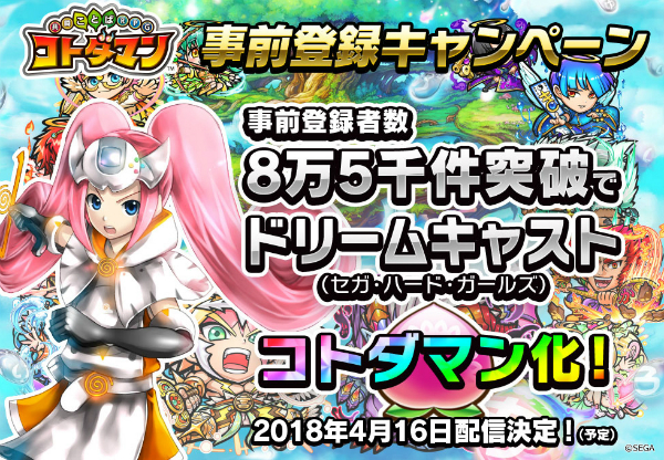 また、事前登録8万5千件突破で、「セガ・ハード・ガールズ」の「ドリームキャスト」のコトダマン化が決定します。ぜひ事前登録をして「ドリームキャスト」を『コトダマン』に登場させましょう。