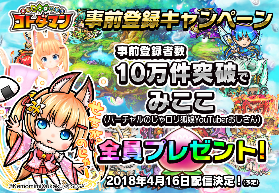 また、事前登録10万件突破で、「バーチャルのじゃロリ狐娘YouTuberおじさん」として活躍するバーチャルYouTuber「ねこます」さんとのコラボキャラクター「みここ」の“コトダマン”化が決定します。