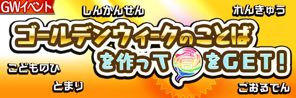 期間中、「れんきゅう」や「しんかんせん」など、GWに関連する言葉が作りやすい限定クエストを開催!初回クリア報酬で、「虹のコトダマ」が300個手に入ります。
