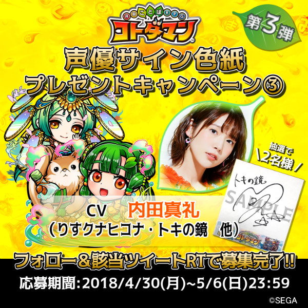 『共闘ことばRPG コトダマン(コトダマン)』にて、2018年4月30日(月)より、本作に登場するキャラクター達のCVを担当する、声優「内田真礼」さんのサイン色紙が当たる、プレゼントキャンペーンの第3弾が開催されます。