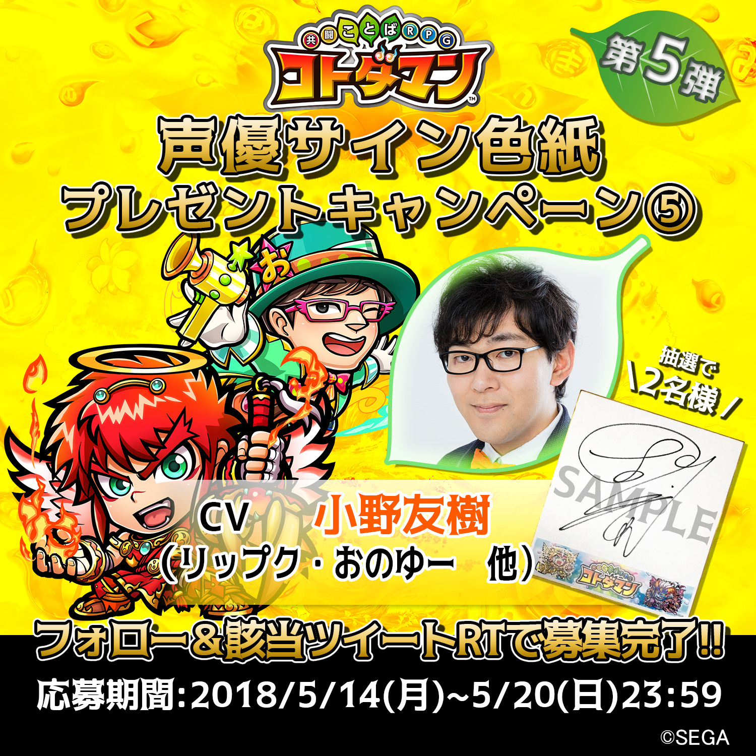 『共闘ことばRPG コトダマン(コトダマン)』にて、本日2018年5月14日(月)より、「声優サイン色紙プレゼントキャンペーンの第5弾」が開催中です。本キャンペーンは、「公式Twitterアカウント」の対象ツイートをリツイートすることで応募完了となり、ゲーム内に登場する「リップク」「おのゆー」を演じる声優「小野友樹」さんのサイン色紙が、抽選で2名に当たります。