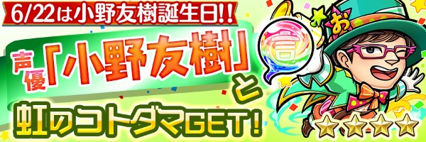 また、本日6月22日(金)より、数々の『コトダマン』のキャラクターボイスを担当する声優「小野友樹」さんの誕生日を記念して、小野さんをゲーム内キャラクター化した「★4 美声道化師・おのゆー(CV:小野友樹)」が手に入る特別な「しゅくだい」イベントが再登場しました。