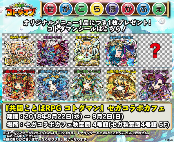 『共闘ことばRPG コトダマン(コトダマン)』は、2018年8月22日(水)より、セガコラボカフェ秋葉原4号館にて、初のコラボレーションカフェが期間限定で実施されます。