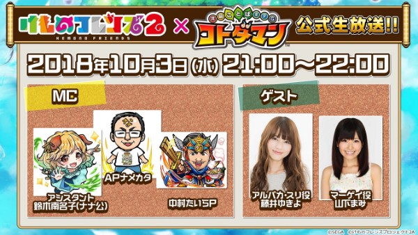 TVアニメ「けものフレンズ2」とのコラボを記念した生放送が配信予定です。「アルパカ・スリ」役の声優「藤井ゆきよ」さんと、「マーゲイ」役の声優「山下まみ」さんをゲストに迎えて、コラボの情報がお知らせされます。
