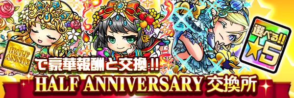 「Half Anniversary記念しょうかん」で獲得した「ハーフアニバチケット」は、「Half Anniversary交換所」にて、★5コトダマンと交換できる「ハーフアニバ★5引換券」や、各種「コエダマ」「降臨の鍵」などの各種アイテムと交換できます。