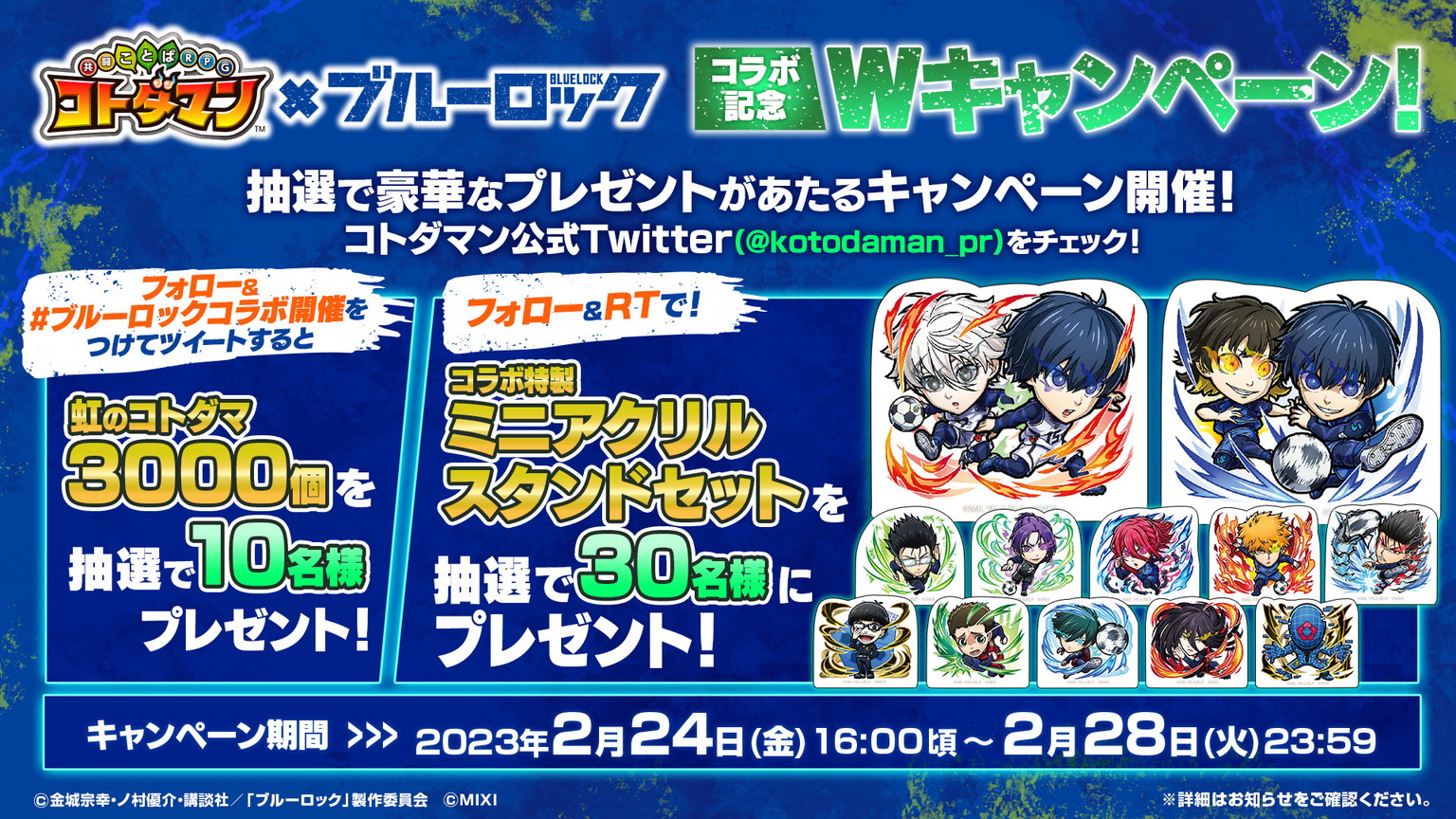 本キャンペーンでは、公式Twitterをフォローし、投稿される対象ツイートをRTすると、抽選で30名にTVアニメ「ブルーロック」コラボ特製ミニアクリルスタンドセットがプレゼントされます。