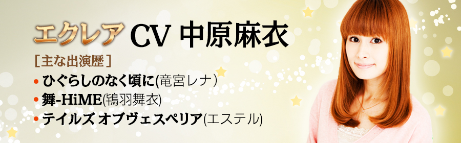 面倒くさがりで、スイーツ大好き!今どきのかわいい女子高生「エクリア」の役を、人気声優「中原麻衣」さんが演じます。