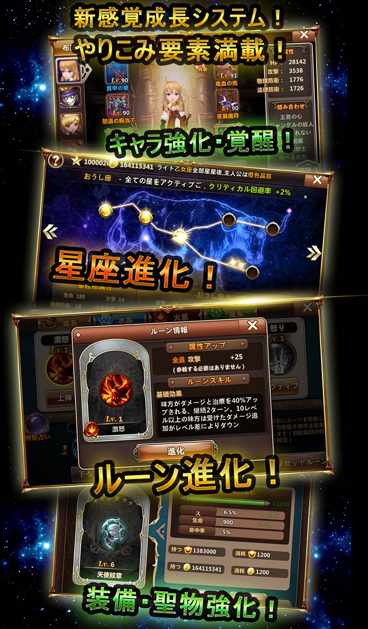 キャラクター強化・覚醒、星座進化、ルーン進化、装備強化・突破・魔化、聖物強化・精錬、宝石システム、神装システムなど今までにない多彩な成長システムを搭載しやり込み度間違いなし!