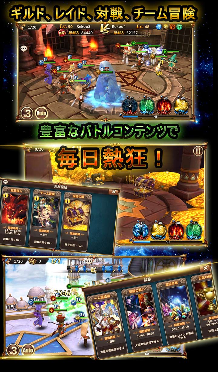 「最大80人 VS 80人」ギルドバトル、最大3人で臨むリアルタイム協力バトル、毎日開催されるレイドバトル「魔王降臨」など全国の仲間と協力し勝利を目指そう!