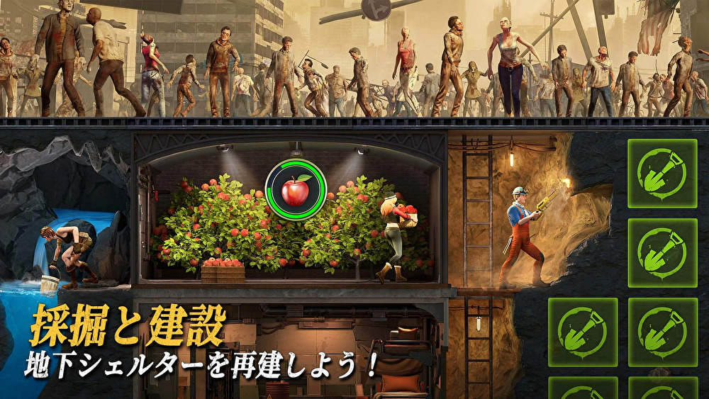 大量のゾンビが蔓延る“ポストアポカリプス”な世界観が魅力の本作では、大人数を収容する地下シェルターに巨大な農場を作ることも可能!