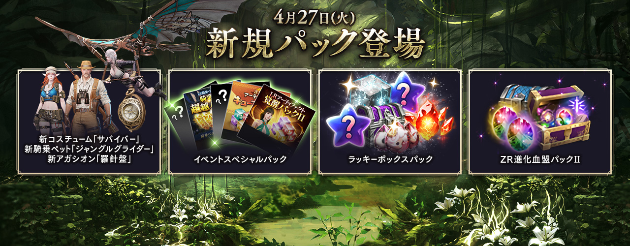 新コスチューム「サバイバー」や、新騎乗ペット「ジャングルライダー」、新アガシオン「羅針盤」のほか、「イベントスペシャルパック」「ラッキーボックスパック」「ZR進化血盟パックII」などが販売中です。