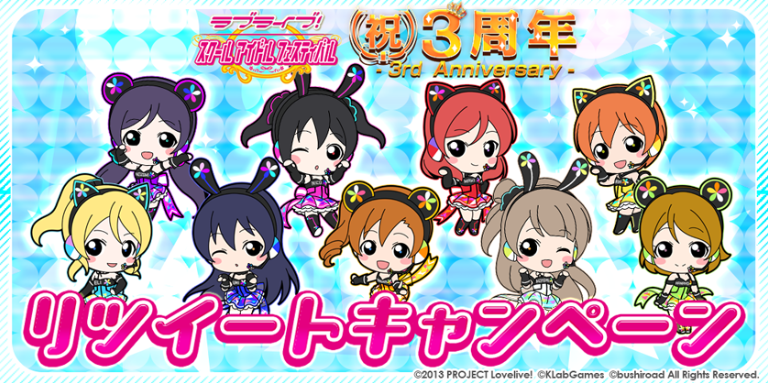 4月16日(土)〜4月22日(金)の期間中、『ラブライブ!スクールアイドルフェスティバル(スクフェス)』3周年を記念して「リツイートキャンペーン」が開始されます。リツイート数に応じてプレゼントが豪華に!