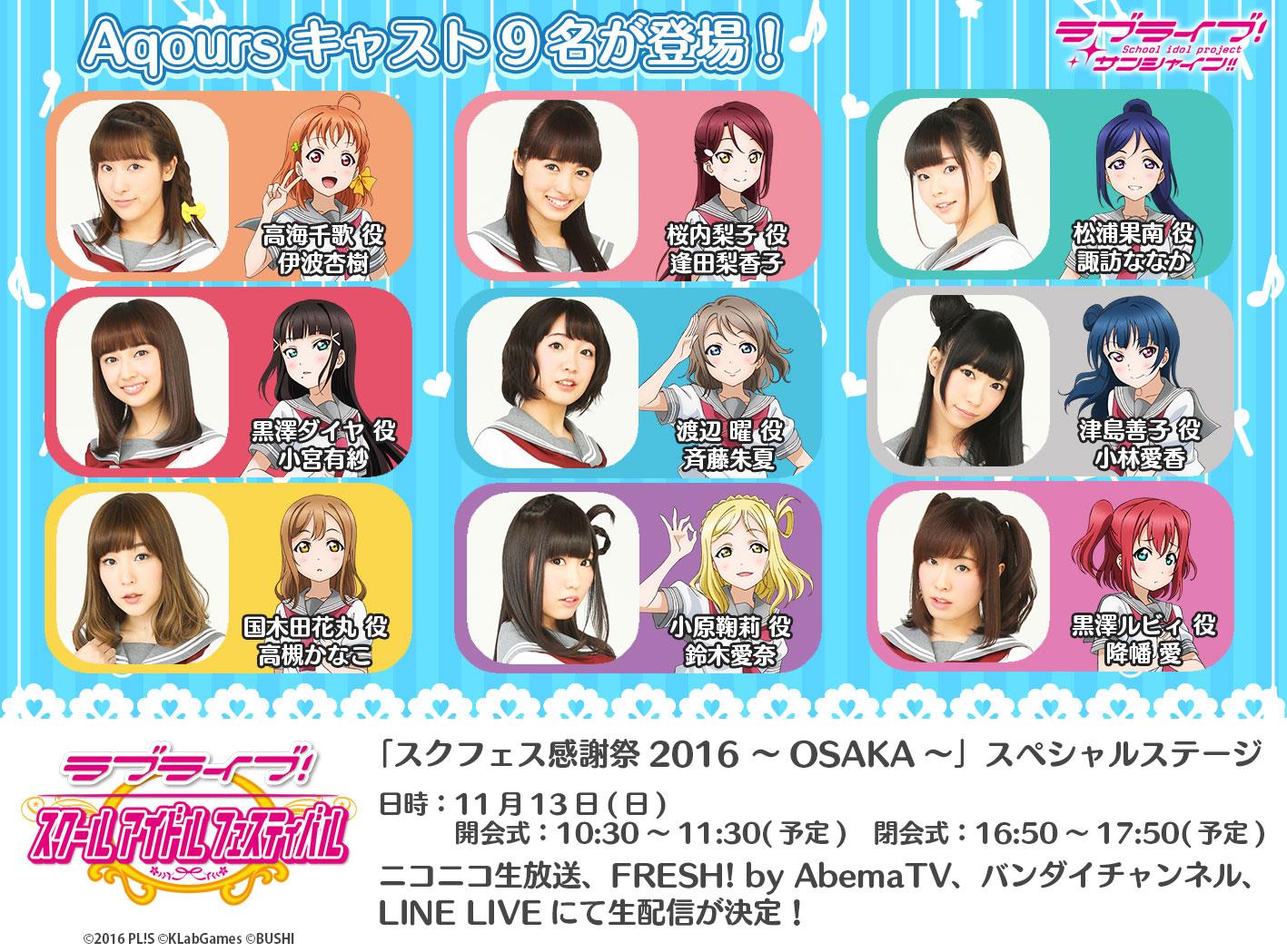 「スクフェス感謝祭 2016 ~OSAKA~」で予定されているスペシャルステージの内容を、ニコニコ生放送、FRESH! by AbemaTV、バンダイチャンネル、LINE LIVEにて生放送が決定!