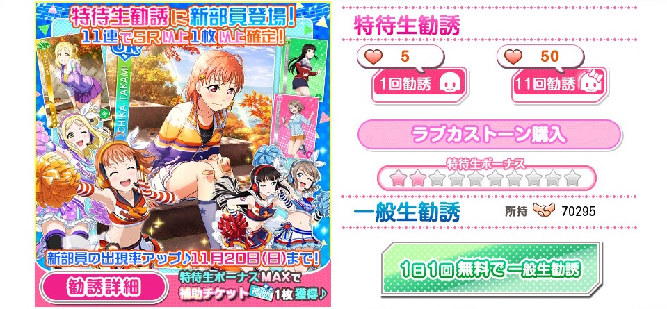 11月20日(日)24:00まで、新規に追加された部員の特待生勧誘での出現率がアップ!レアリティ内における出現率がアップし、新規追加部員が獲得しやすくなっています。