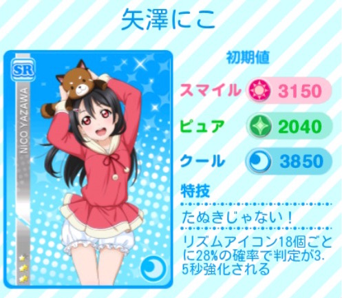 ぬいぐるみに顔を乗せてジト目でこちらを見つめる、珍しい表情の海未ちゃんが登場しました。さらに、覚醒すると動物モチーフのステージ衣装に大変身!おしとやかな海未ちゃんと、お決まりのポーズを決めたにこが対照的ですが、どちらも可愛らしいですね。
