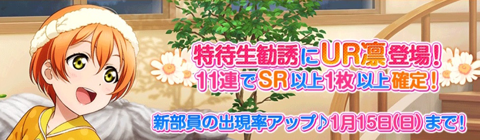 1月15日(日)24時まで、新規に追加されたメンバーの特待生勧誘での出現率がアップします。さらに、11連特待生勧誘でSR以上のレアリティが1枚以上確定!