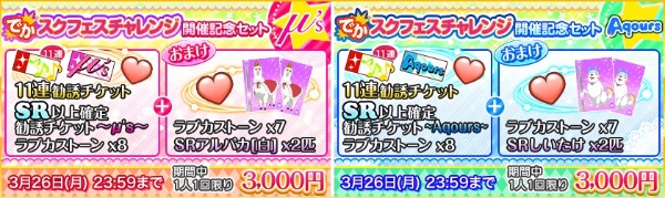 期間限定でお得な「でかスクフェスチャレンジ開催記念セット」が販売されます。「11連勧誘チケット」や「SR以上確定勧誘チケット」を手に入れるチャンスです。