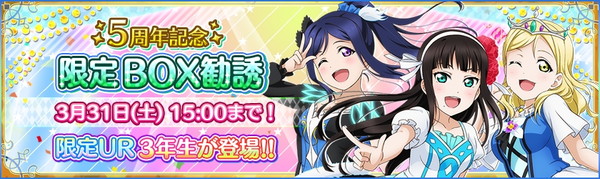 『ラブライブ!スクールアイドルフェスティバル(スクフェス)』にて、5周年記念して、Aqours「WATER BLUE NEW WORLD」衣装の限定UR部員が登場する、「AqoursのBOX勧誘」が開催されます。