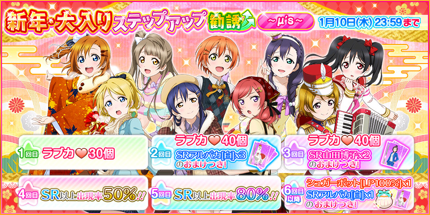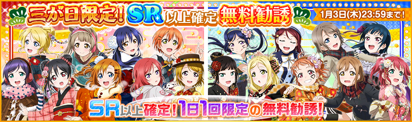「みんなでワイワイ全世界同時チャレンジ」達成を祝して、「三が日限定!SR以上確定無料勧誘」が開催されます。