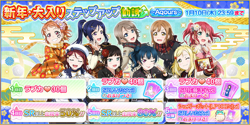 μ's・Aqoursの各モードで、1回勧誘が1日1回ずつ無料で行えます。レアリティSR以上が確定となっているので、この機会をお見逃しなく!
