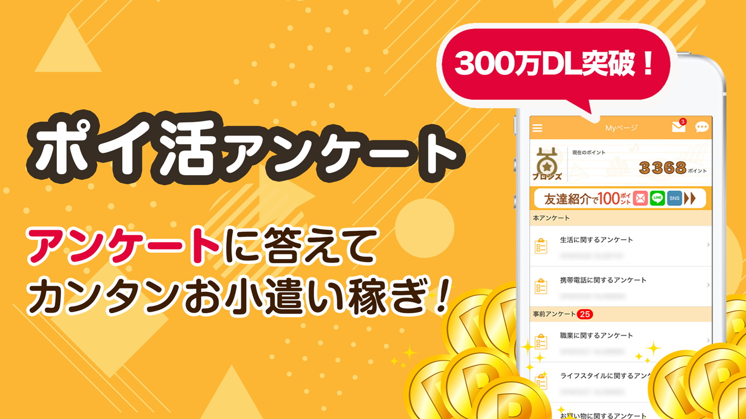 簡単なアンケートに答えて無料でポイントが稼げるお小遣いアプリ。簡単ログイン&新着アンケートのお知らせを逃さず受け取れます!貯めたお小遣いポイントは現金やAmazonギフト券等と交換OK♪答えていただくアンケートは、コンビニの飲料やお菓子、ファッション、ゲームのことなど様々です。
