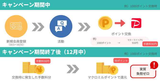 本キャンペーンでは、10月中に新規会員登録をして、11月末までにPayPayへのポイント交換をすると、交換時に発生した手数料分のマクロミルポイントが還元されます。