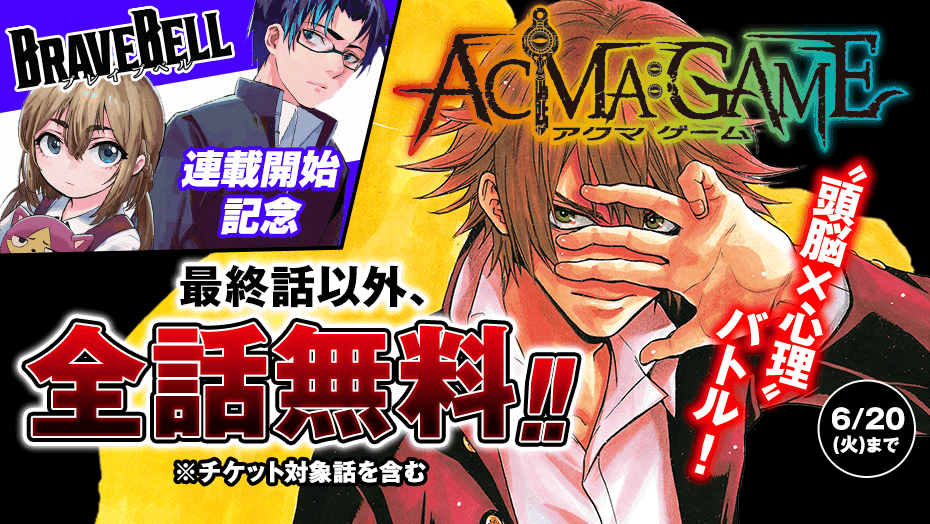 漫画アプリ「マガポケ」にて、2023年6月20日(火)まで、『ACMA:GAME』が最終話以外、全話無料配信されています。