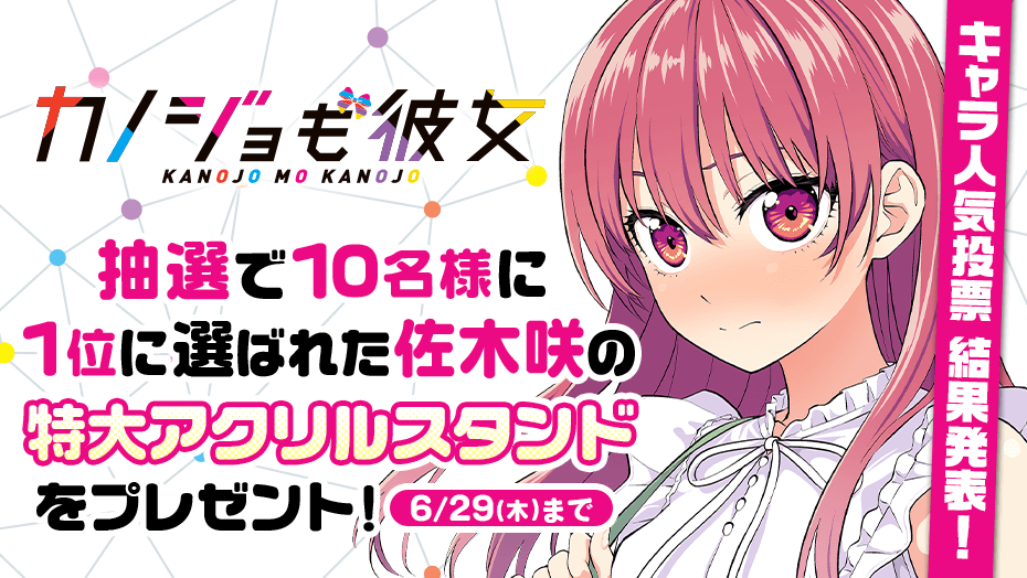 漫画アプリ「マガポケ」にて、『カノジョも彼女』のキャラ人気投票の結果が発表されたほか、抽選で10名に1位に選ばれた佐々木咲の特大アクリルスタンドが当たるキャンペーンが実施中です。