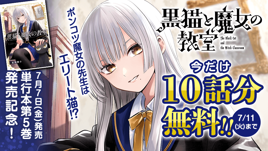漫画アプリ「マガポケ」にて、単行本第5巻の発売を記念して、2023年7月11日(火)まで、『黒猫と魔女の教室』が10話分無料配信されています。