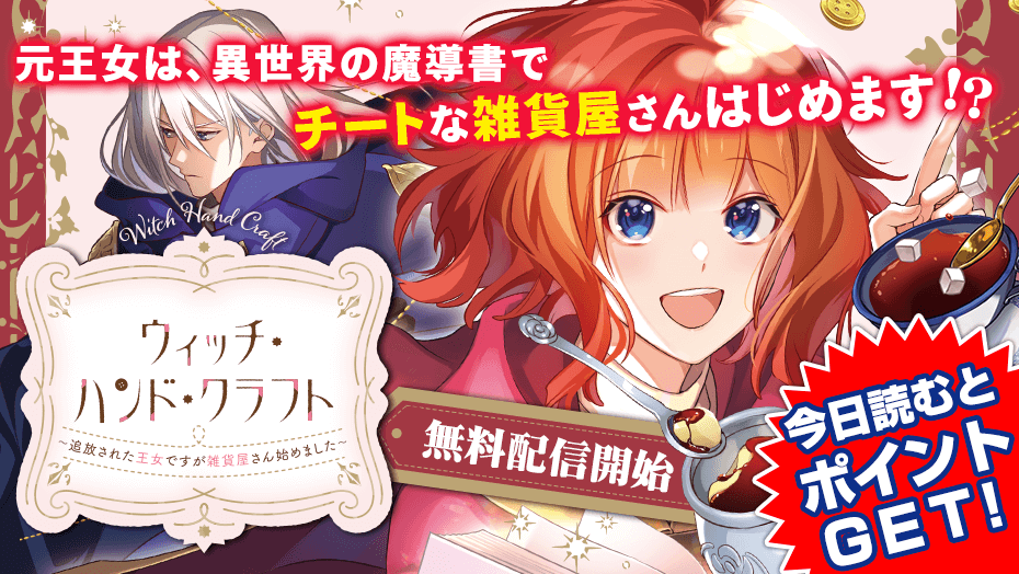 漫画アプリ「マガポケ」にて、本日2023年7月11日(火)より、『ウィッチ・ハンド・クラフト ~追放された王女ですが雑貨屋さん始めました~』の無料配信が開始されたほか、3話分が無料配信されています。