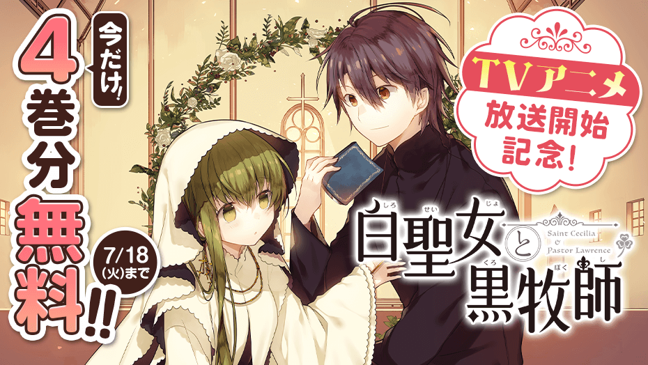 漫画アプリ「マガポケ」にて、TVアニメの放送開始を記念して、2023年7月18日(火)まで、『白聖女と黒牧師』が4巻分無料配信されています。