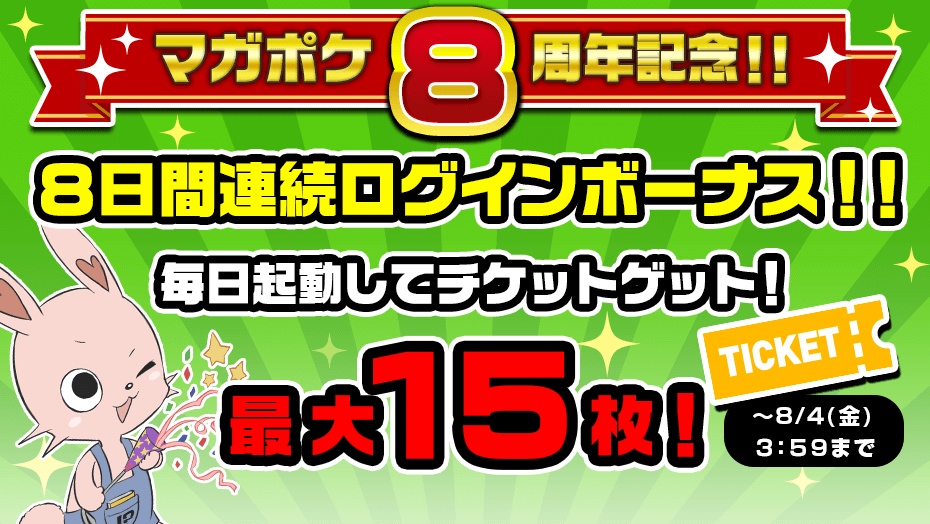 「マガポケ」8周年を記念して、8日間連続ログインボーナスが開催中です。