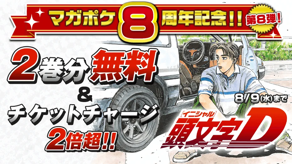 「マガポケ」の8周年を記念して、2023年8月9日(水)まで、しげの秀一先生の人気漫画『頭文字D』が2巻分無料&チケットチャージ2倍超となっています。