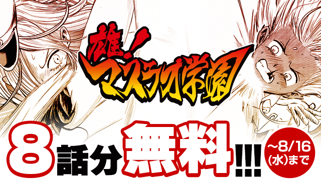 漫画アプリ「マガポケ」にて、単行本第1巻の発売を記念して、2023年8月16日(水)まで、『雄!マスラオ学園』が8話分無料配信されています。