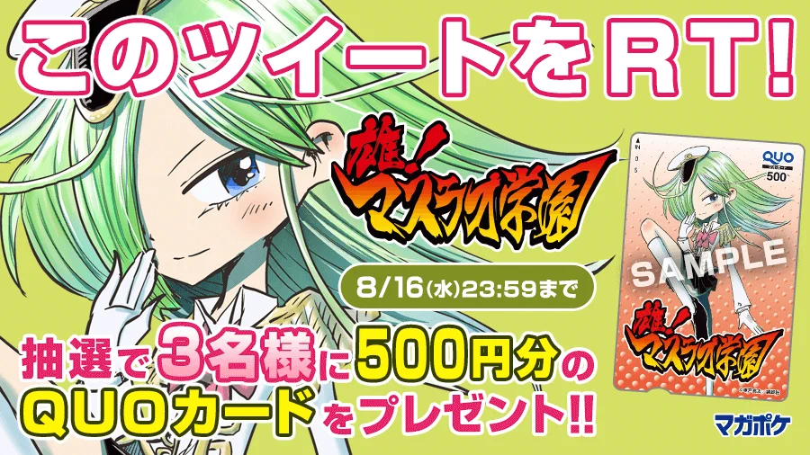 本キャンペーンでは、公式X(Twitter)アカウント(@magapoke)をフォローしたのち、対象の投稿をリポスト(RT)し、『雄!マスラオ学園』を読むと、抽選で3名にQUOカード500円分がプレゼントされます。
