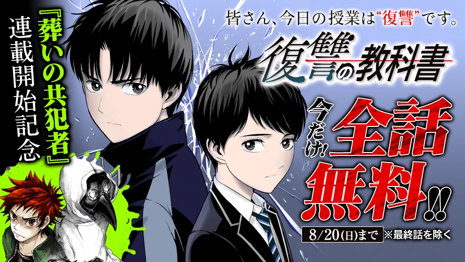 漫画アプリ「マガポケ」にて、「葬いの共犯者」の連載開始を記念して、2023年8月20日(日)まで、『復讐の教科書』が最終話以外、全話無料配信されています。