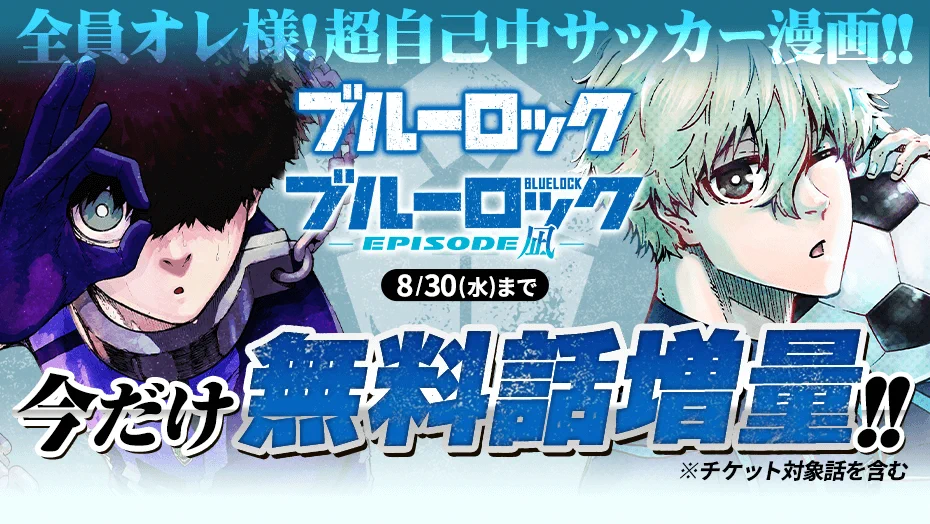 漫画アプリ「マガポケ」にて、2023年8月30日(水)まで、『ブルーロック』が2巻分無料配信されているほか、3巻から5巻までを無料チケットで読めるチケットキャンペーンが実施されています。
