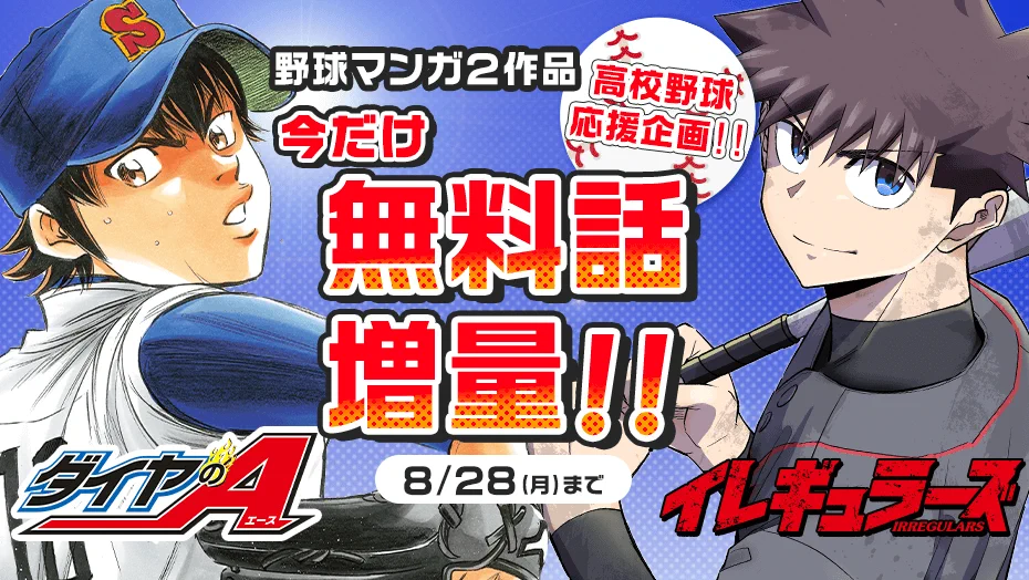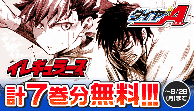 感動と興奮の高校野球漫画『ダイヤのA』が5巻分無料、嫌われ者共のド直球野球譚『イレギュラーズ』が2巻分無料となっています。甲子園の決勝に合わせて、熱血野球マンガを読みましょう。