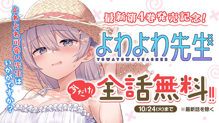 漫画アプリ「マガポケ」にて、『よわよわ先生』の単行本第4巻発売を記念して、2023年10月24日(火)まで、最新話以外、全話無料配信されています。