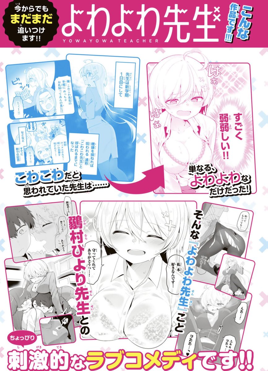 新学期。2年生に進級した男子高校生・阿比倉くん達のクラス担任になったのは、機嫌を損ねれば呪われると噂の通称「こわこわ先生」こと、鶸村ひより先生だった!そんな、「こわこわ先生」の裏の一面を、ある日の放課後、目撃してしまった阿比倉くんは……。まさかのギャップに悶絶必至!あなたの庇護欲を掻き立てる、よわよわラブコメ開幕!!