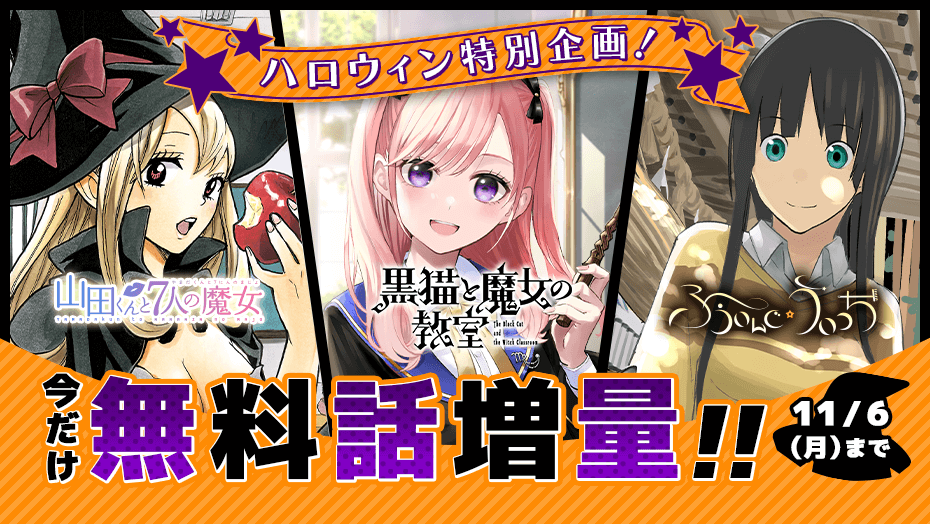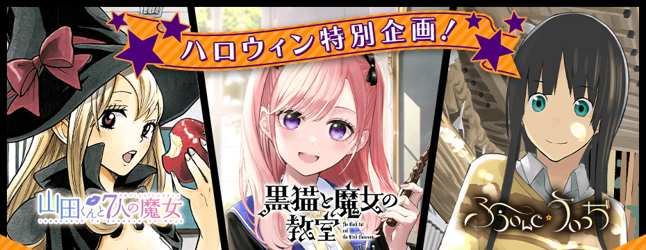 本キャンペーンでは、魔法学園ファンタジー『黒猫と魔女の教室』が6話分無料、のんびり魔女のまったり生活『ふらいんぐうぃっち』が1巻分無料、キスからはじまるスクールコメディ『山田くんと7人の魔女』が3巻分無料となっています。ハロウィンに合わせて人気3作品を読みましょう。