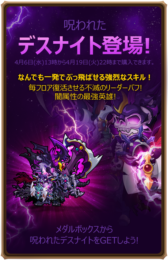 全体にダメージを与え、味方と敵を全部ノックバックさせるスキルを使用し、死亡時1度だけ復活できる英雄「デスナイト」を獲得できるメダルボックスが販売開始!