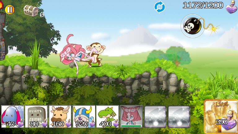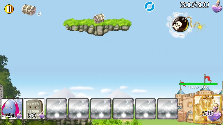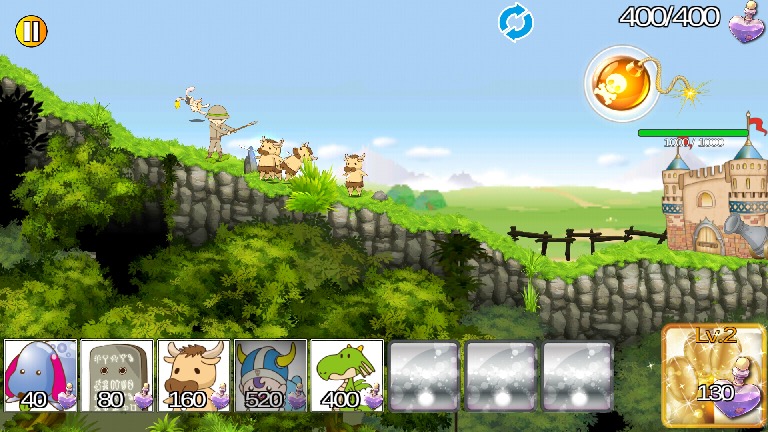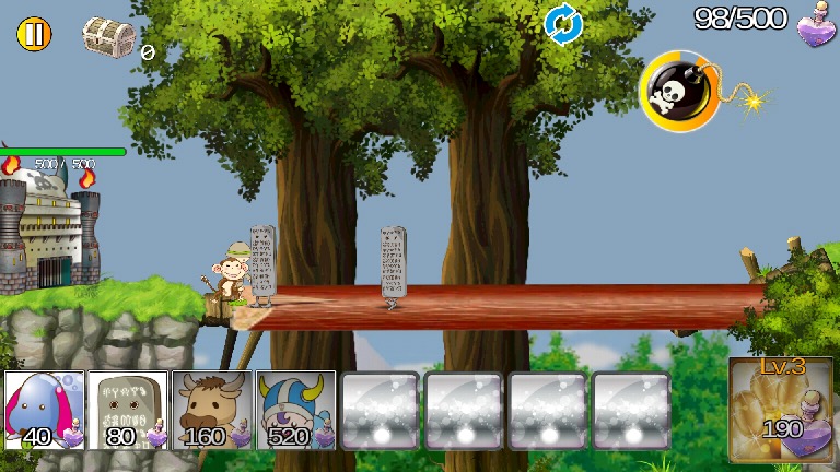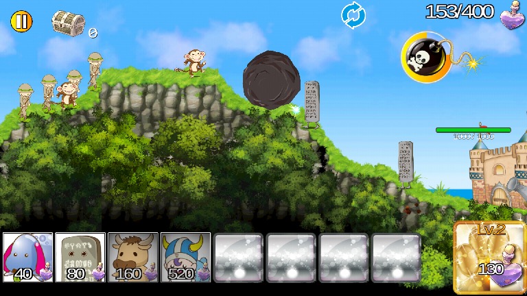 右側に自分の城、左側には敵の城、それから画面下のモンスターアイコンがある。呼び出したいモンスターをタップすると、自分の城から出陣して、自動的に敵の陣地へと向かっていく仕組みだ。