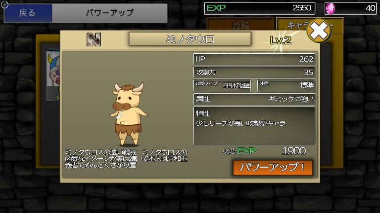 ステージクリアで手に入る経験値を使えば、モンスターをパワーアップさせることができる。攻撃こそ最大の防御!敵陣を突破できるような強固な編成で攻めていこう。