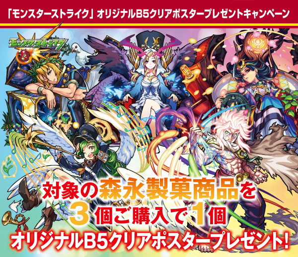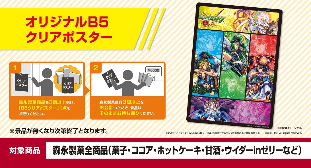 全国の総合スーパー「イオン」(北海道・九州・沖縄を除く)にて、対象の森永製菓の製品各種(お菓子、ホットケーキ、ココア等)を3個購入すると、『モンスターストライク』オリジナルB5クリアポスターがプレゼントされます。
