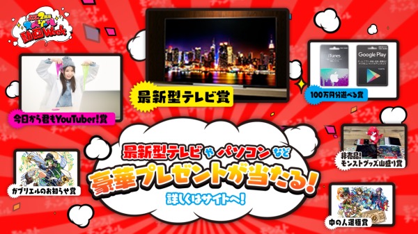 『モンスト』公式YouTubeチャンネル2周年を記念して、YouTubeも見れる最新型の「4K有機ELテレビ」や、届いたその日からYouTuberになれる「YouTuberセット」、100万円分の「iTunes Card」または、「Google Play ギフトカード」などの総額200万円相当の豪華賞品が当たるキャンペーンが実施!