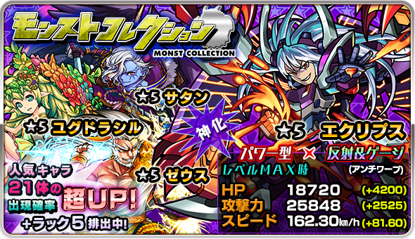 今回の「モンストコレクション」は、『モンスターストライク』の人気キャラクター21体が大集合!さらに神化合体が可能になった「真田幸村」、「ハンターキング」、「エクリプス」の3体も対象モンスターになっているので、今が狙い目です!