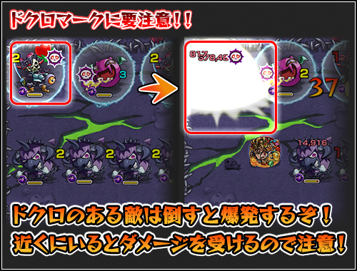 ドクロのアイコンが付いている敵は要注意!倒した後に爆発し、近くに居ると大ダメージを受けてしまいます!