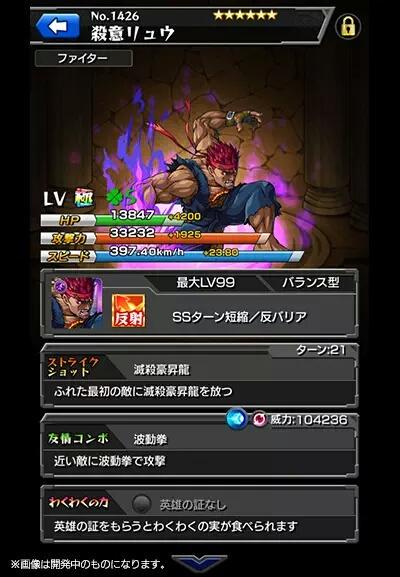 リュウの神化後闇属性☆6 殺意リュウ!殺意の波動に目覚めてしまった彼の注目ポイントは、やはり攻撃力とスピードの高さ!バランス型とは思えない高火力と超スピード、更にSSターン短縮とアンチ重力バリアも付いているので、素早く敵を倒すスタイルの予感。副友情コンボにはエナジーサークルも付いているので、まさに戦闘特化型…!?